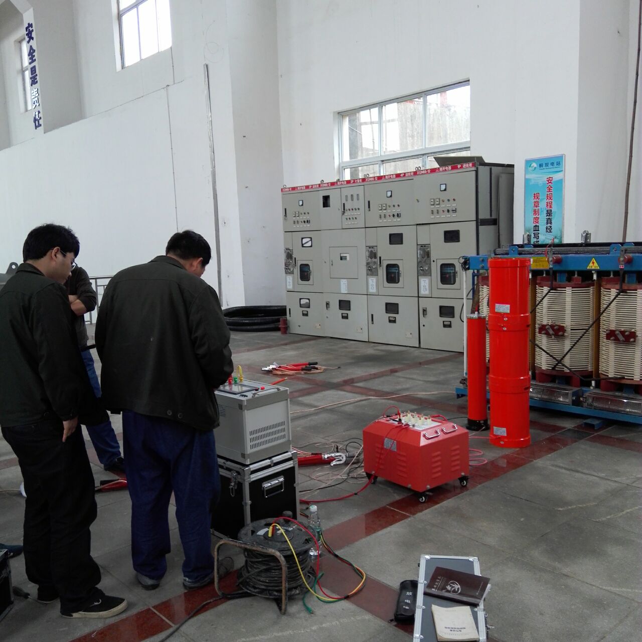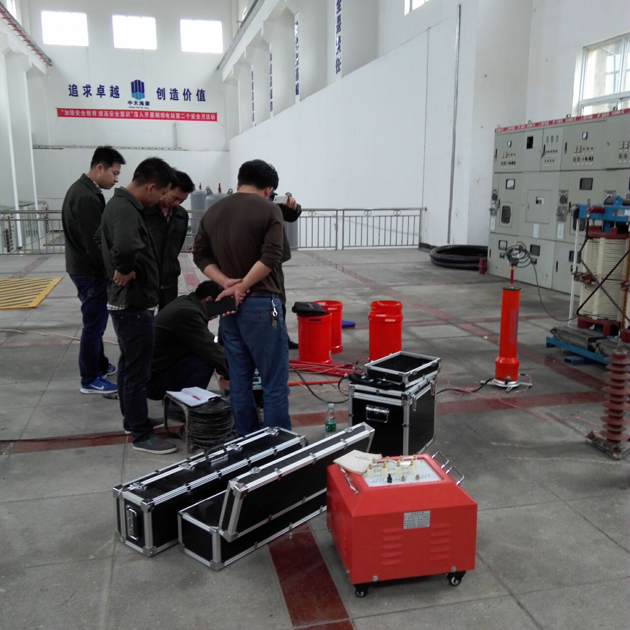 此次培訓的重點設備是YTC850-135kVA/108kV變頻串聯(lián)諧振試驗裝置。我公司的該設備為專利產(chǎn)品,諧振電源調(diào)頻及功率元件使用先進的日本進口的優(yōu)質(zhì)元器件,設計的是諧振式濾波電路,能改善輸出電壓的波形畸變,獲得很好的正弦波形,有效的防止了諧波峰值對試品的誤擊穿。變頻電源保護功能強,穩(wěn)定性好;具備具備全自動(自動調(diào)諧、自動升壓)、全手動(手動調(diào)諧、手動升壓)以及半自動(自動調(diào)諧、手動升壓及手動調(diào)諧、自動升壓)的多種工作模式,可任意切換使用;操作方便;大屏幕觸摸LED液晶彩屏和外接鼠標直接完成各種參數(shù)的設置,試驗結(jié)果可保存、打印、上傳、回查等。