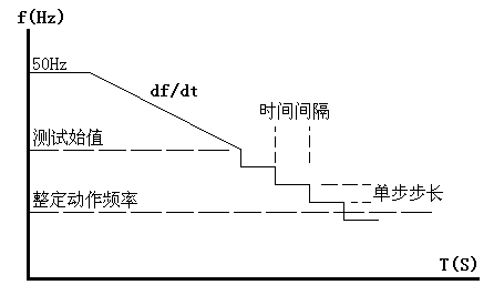 動作頻率的測試方法:測試時頻率分兩階段變化:開始以50Hz輸出,經(jīng)過變化前延時后,先按所設(shè)定的df/dt均勻下滑(或上滑)至測試始值頻率,然后按設(shè)定的步長以一定時間間隔逐格降低(或上升)頻率,在該過程中如保護(hù)動作,則測出動作值。如未動作,當(dāng)變化至測試終值,即認(rèn)為保護(hù)不會動作而結(jié)束該項目測試。
