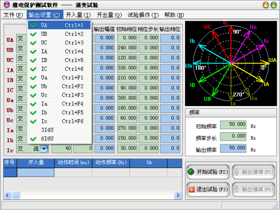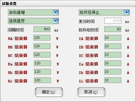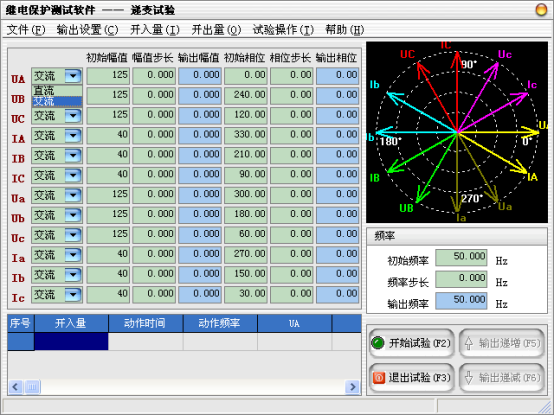 當(dāng)需要使用的輸出相被選擇后,可以設(shè)定微機(jī)繼電保護(hù)測(cè)試儀各輸出相的起始參數(shù),比如幅值、相位,接著可以設(shè)定幅值的變化步長(zhǎng)和相位的變化步長(zhǎng)。一旦通道的輸出達(dá)到大值或小值后,如果試驗(yàn)還沒(méi)有停止,通道繼續(xù)保持輸出,不再遞增或遞減。