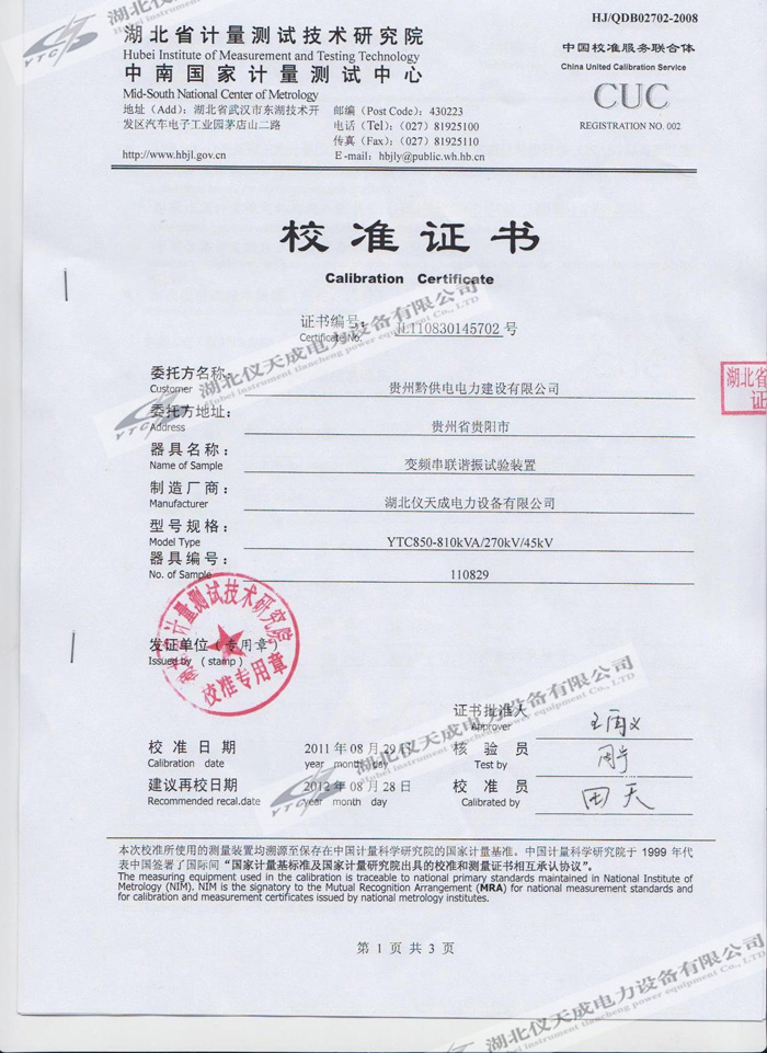 YTC850-810kVA/270kV/45kV變頻串聯(lián)諧振試驗(yàn)裝置的資質(zhì)證書(shū)