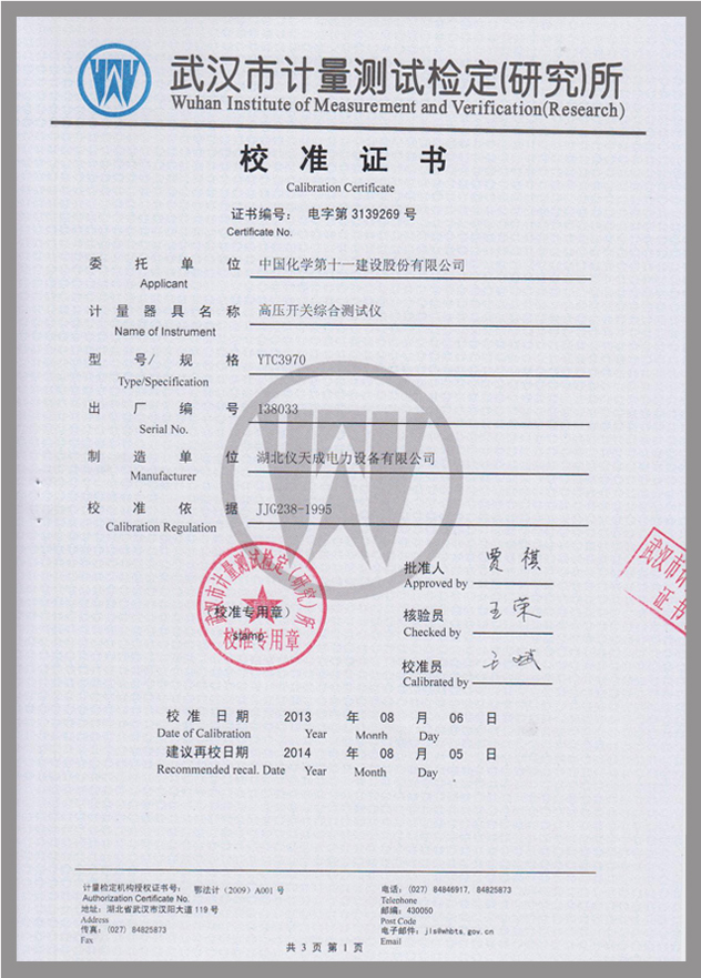 YTC3970高壓開關(guān)動(dòng)特性測試儀鑒定證書
